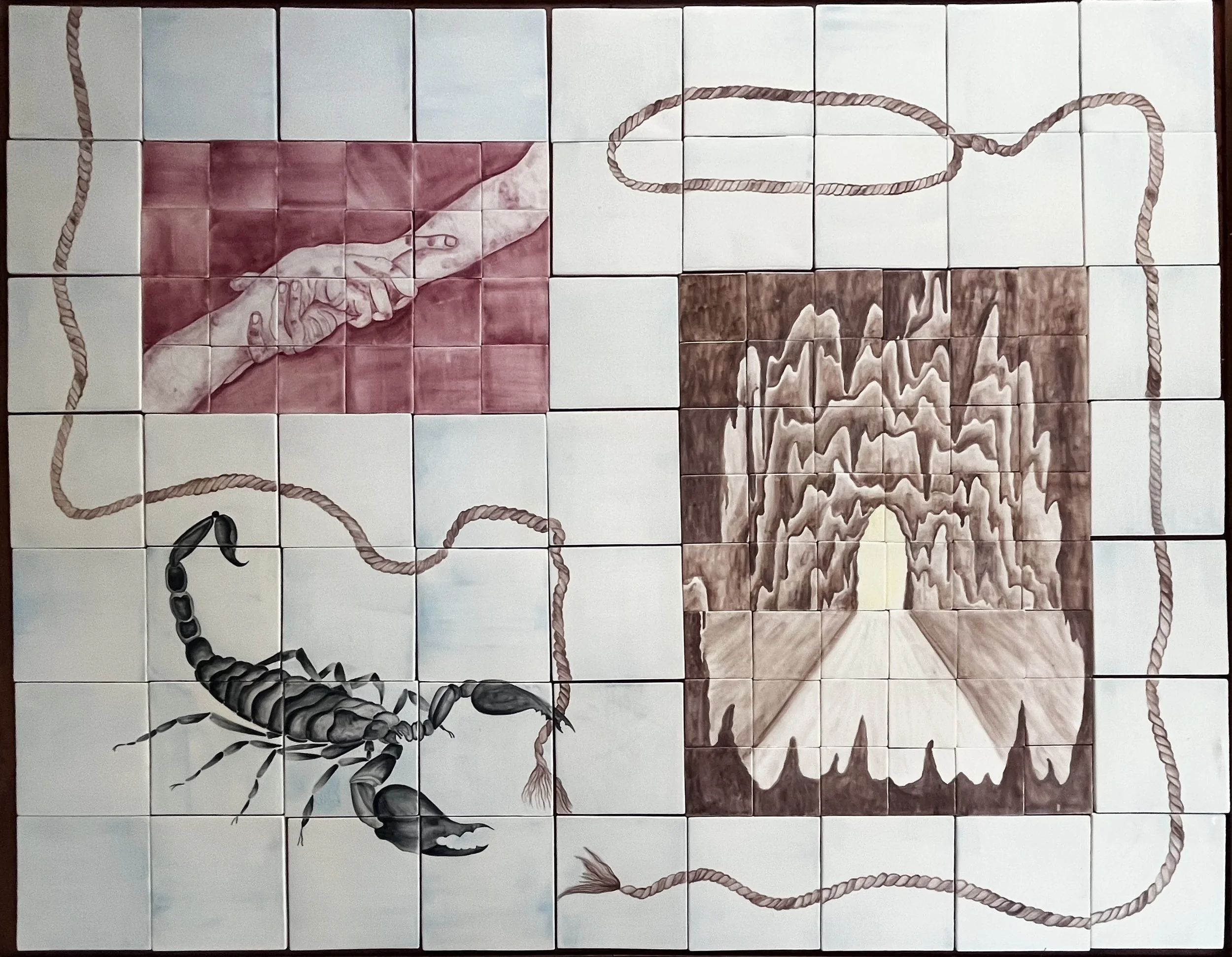 Mientras que los jarrones retratan seres asociados a ciclos de regeneración entre la vida y la muerte, los azulejos articulan una cartografía poética del vínculo peninsular. Por ejemplo, el henequen que marcó la economía política de Yucatán fue la materia prima para elaboración de cuerdas, que nos remiten tanto al mar como a la actividad ganadera presente en ambas penínsulas.